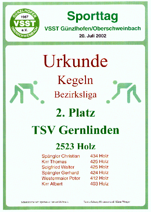 | 26.07.2002 | Beim Sportkegelturnier in Günzelhofen belegte die Mannschaft aus Gernlinden einen hervorragenden 2. Platz hinter Puchheim. Folgende Spieler vertraten die Mannschaft: 1.) Spängler Christian - 434 Holz 2.) Kirr Thomas - 425 Holz 3.) Westermaier Peter - 412 Holz 4.) Spängler Gerhard - 424 Holz 5.) Seigfried Walter - 425 Holz 6.) Kirr Albert - 403 Holz Folgende Mannschaften belegten die ersten drei Plätze: 1.) Platz: Vollkugel Puchheim - 2571 Holz 2.) Platz: TSV Gernlinden - 2523 Holz 3.) Platz: Mering - 2511 Holz hier können Sie die Urkunde betrachten |
