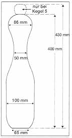 Der Kegel ist in seinen Abmessungen und Gewicht genormt. Die Höhe beträgt 40 cm, das Gewicht liegt zwischen 1750 g und 1800 g. Der "König" überragt die anderen Kegel um 3 cm und sein Gewicht beträgt 1850 g. Das Material bestand früher aus Hartholz, wogegen heute fast nur noch Kunststoffkegel verwendet werden |